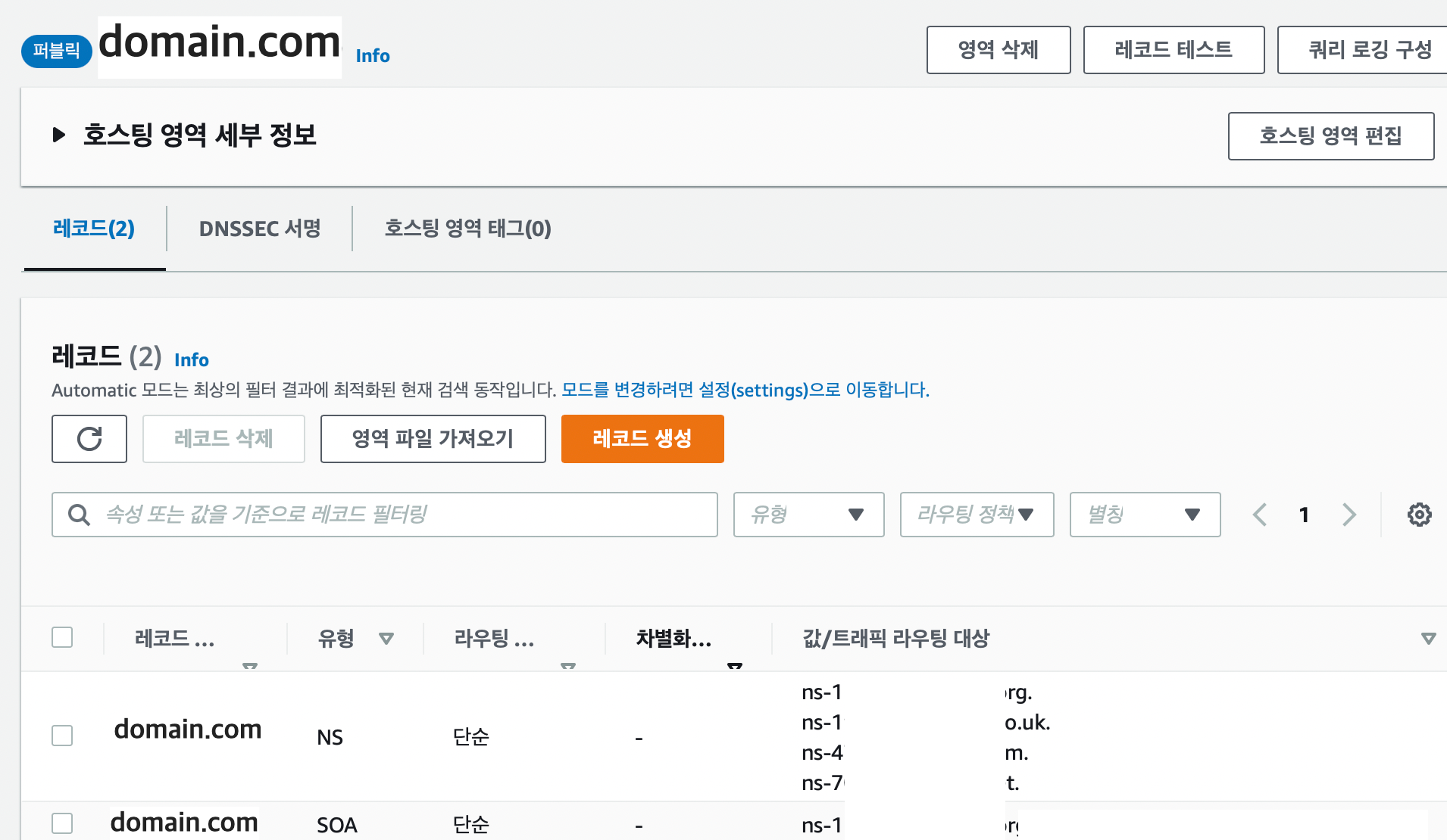 현재 레코드는 NS(네임서버), SOA 유형 각 1개로, 총 2개 존재합니다.