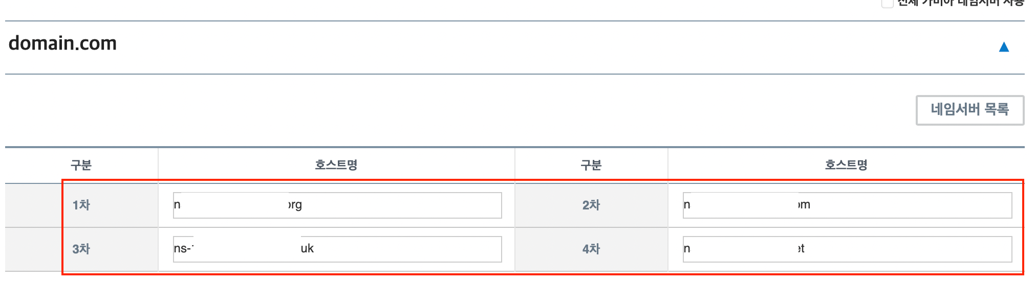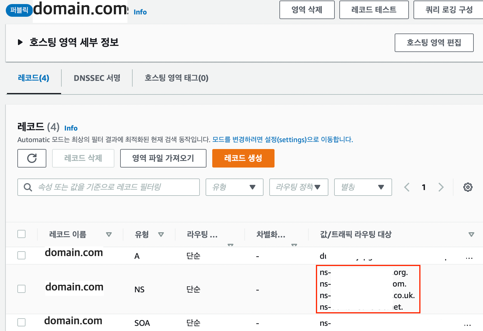 호스팅 영역에서 확인할 수 있던 NS 레코드의 라우팅 대상 4개를 넣어주면 됩니다.