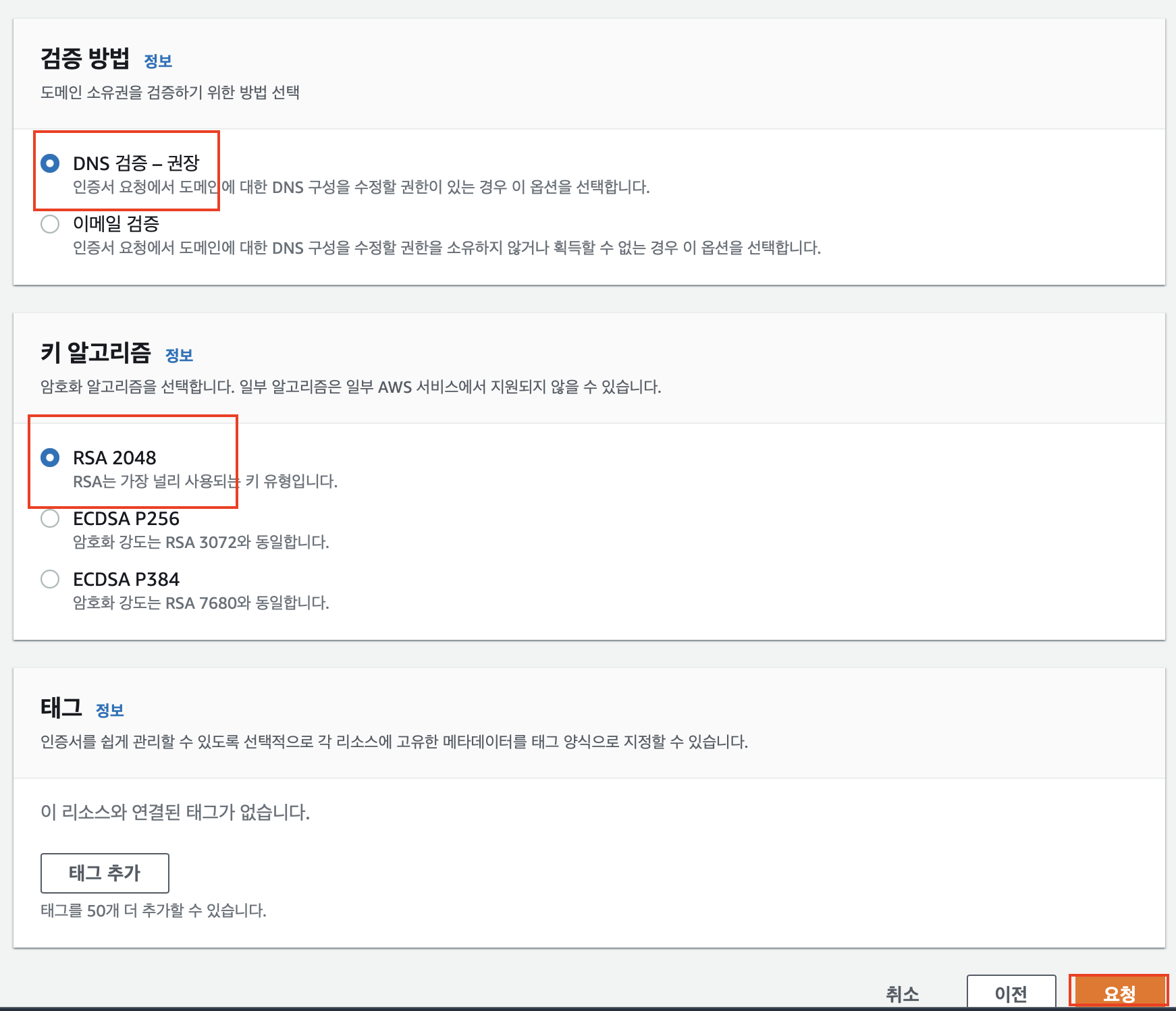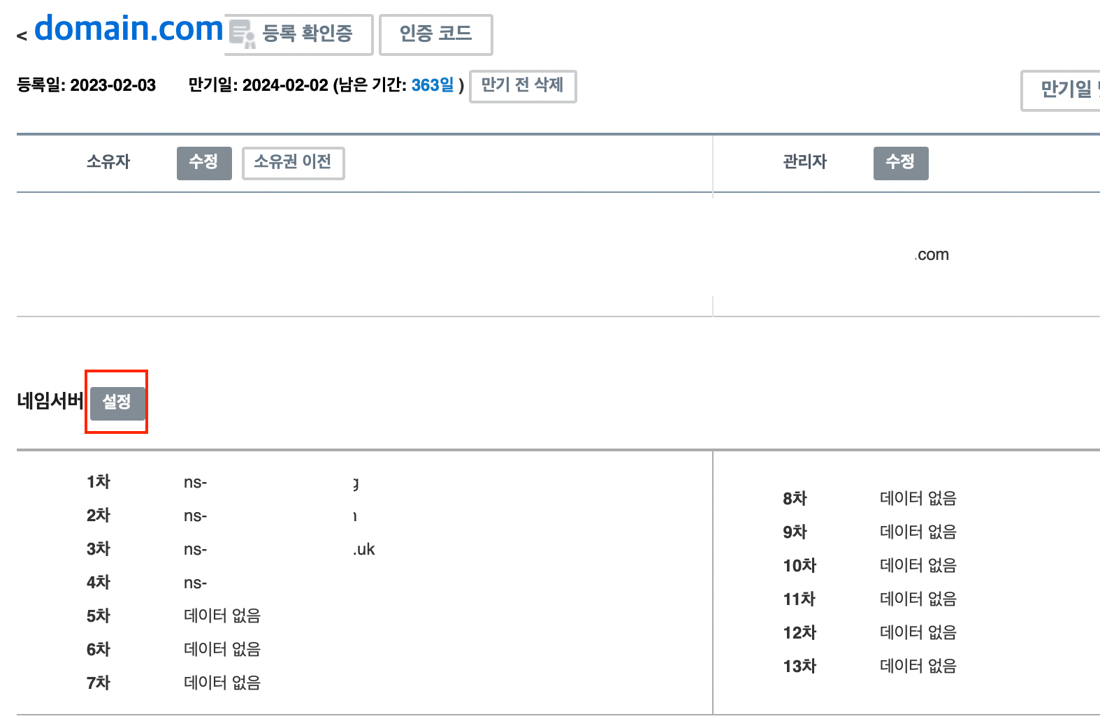 DNS 검증 기준, 검증 대기중 / 아니요 / 부적격 이 나온다면 정상입니다.