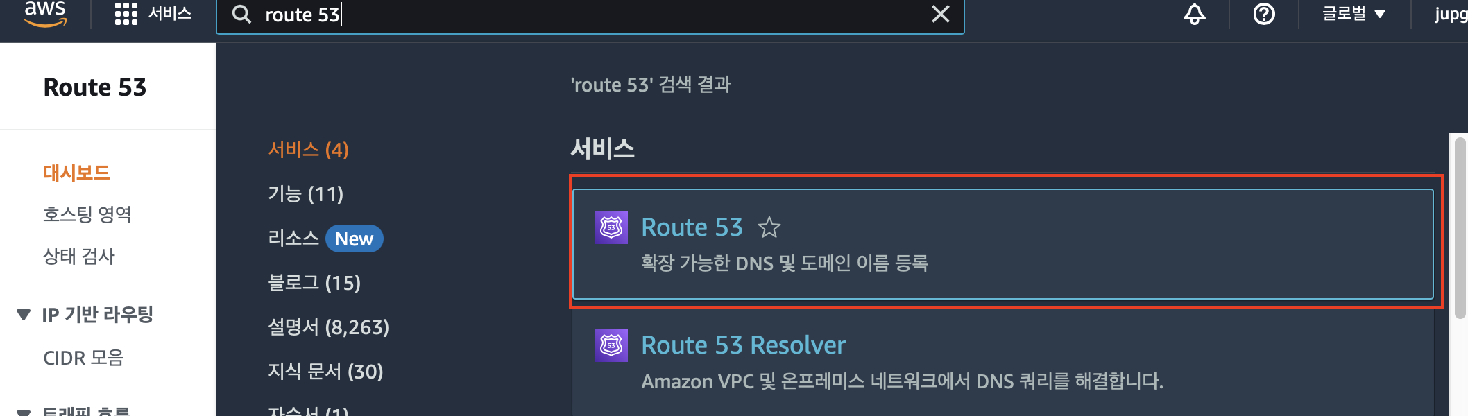 먼저 AWS 계정에 로그인 하여 Route 53 서비스에 대시보드로 이동합니다.