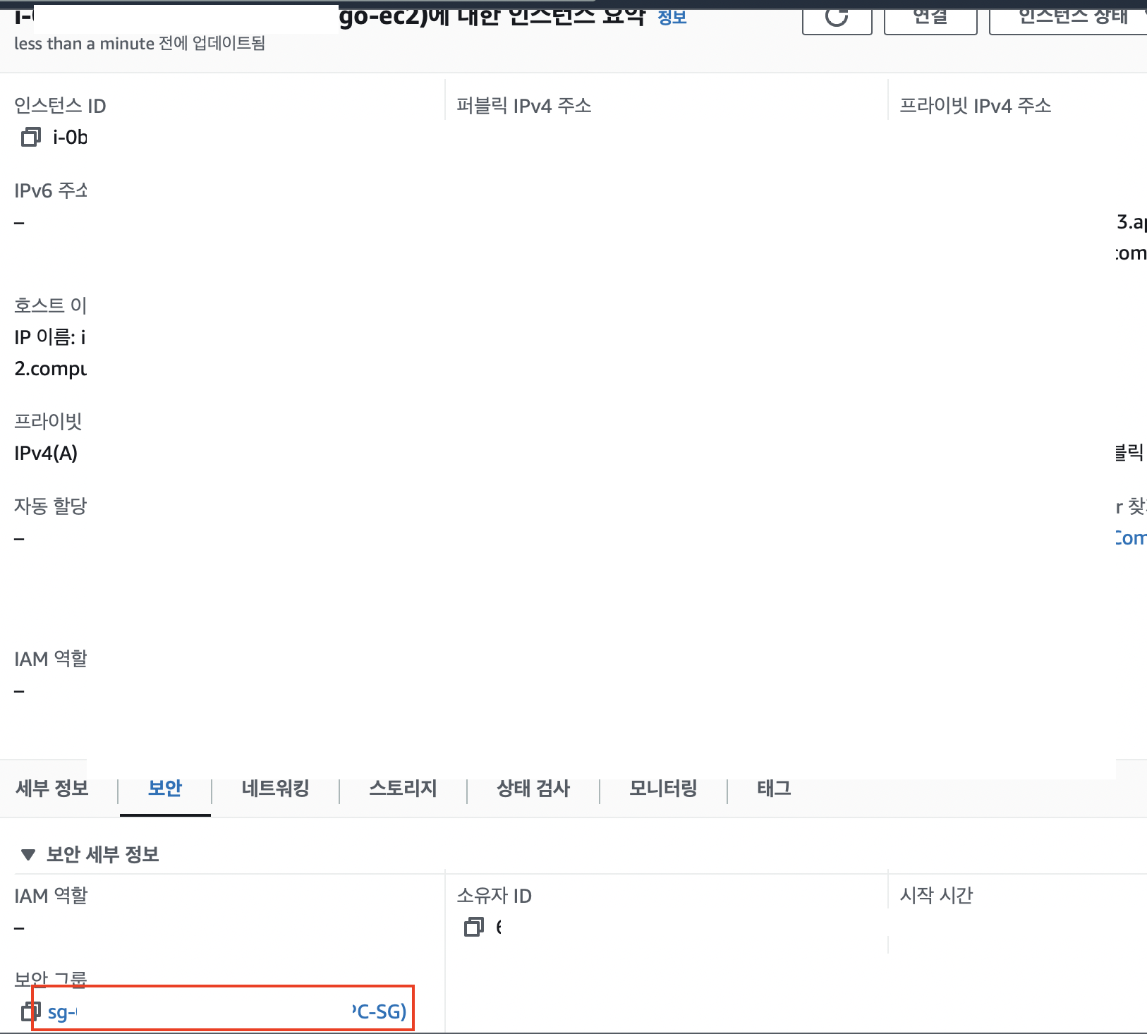 연결할 EC2 인스턴스의 정보 탭에 들어가서, 사용 중인 보안 그룹(Red box)을 클릭합니다.
