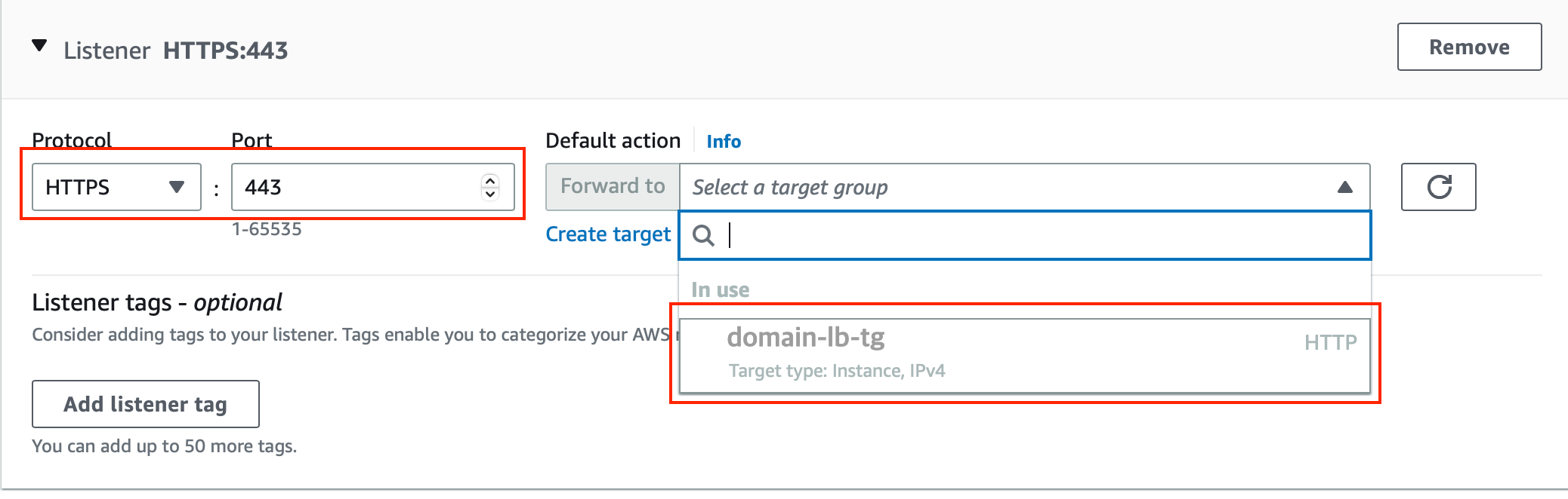 - 로드 밸런서를 만들어 https://domain.com의 443, http://domain.com의 8080번 포트에 대한 리스너를 추가