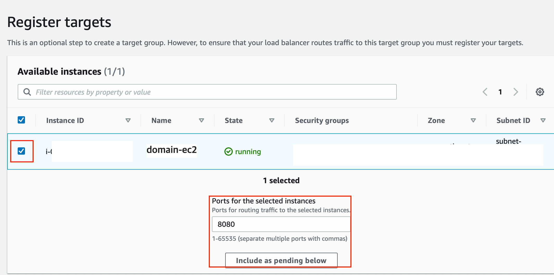 사용할 인스턴스를 체크하고, 포트 번호를 확인한 후 아래에 포함시킵니다.