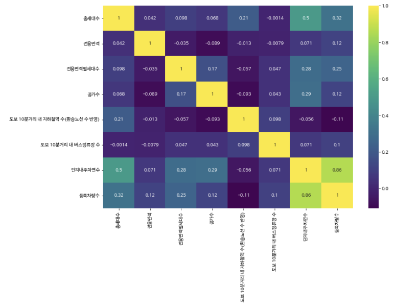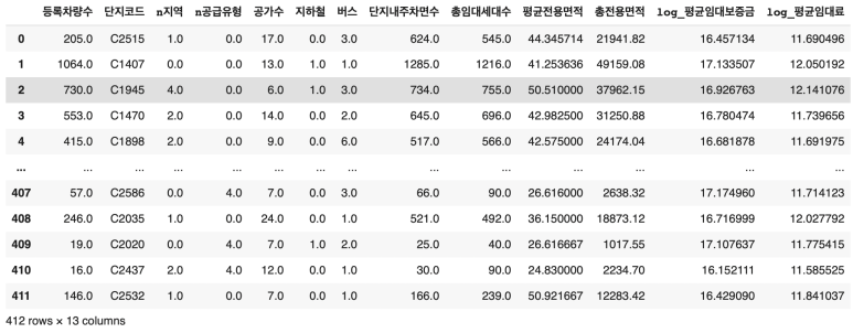 tmp_train = df_train[['등록차량수', '단지코드', 'n지역', 'n공급유형', '공가수', '지하철', '버스', '단지내주차면수', '총임대세대수', '평균전용면적', '총전용면적', 'log_평균임대보증금', 'log_평균임대료']]