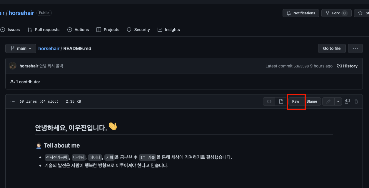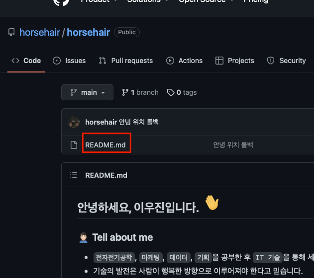 아래에는 커밋 별 기록도 확인할 수 있습니다.
