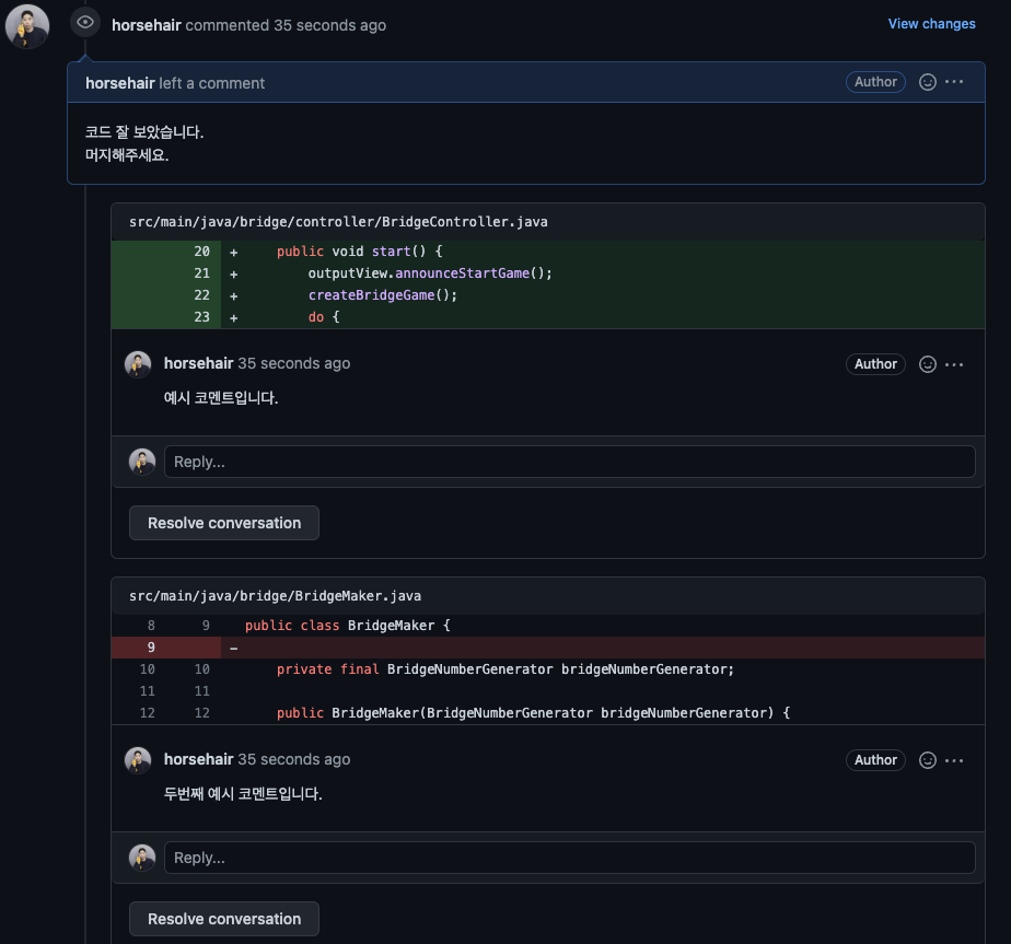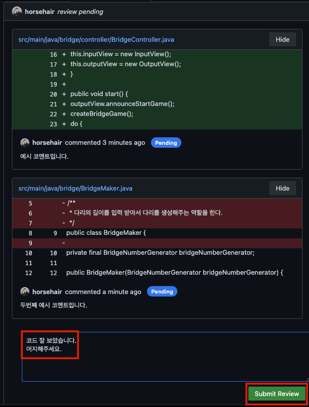 이전에 달았던(보류해두었던) 코멘트들이 묶여있는 걸 확인할 수 있습니다.