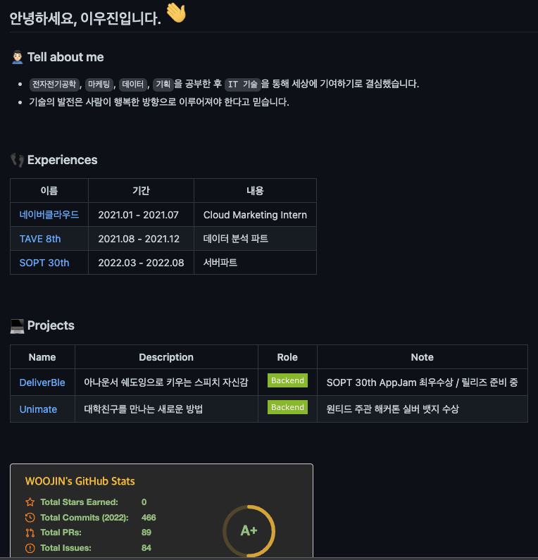 | 깃허브 리드미(프로필) 꾸미기 - 초초초 간단 버전 (0) | 2022.10.20 |