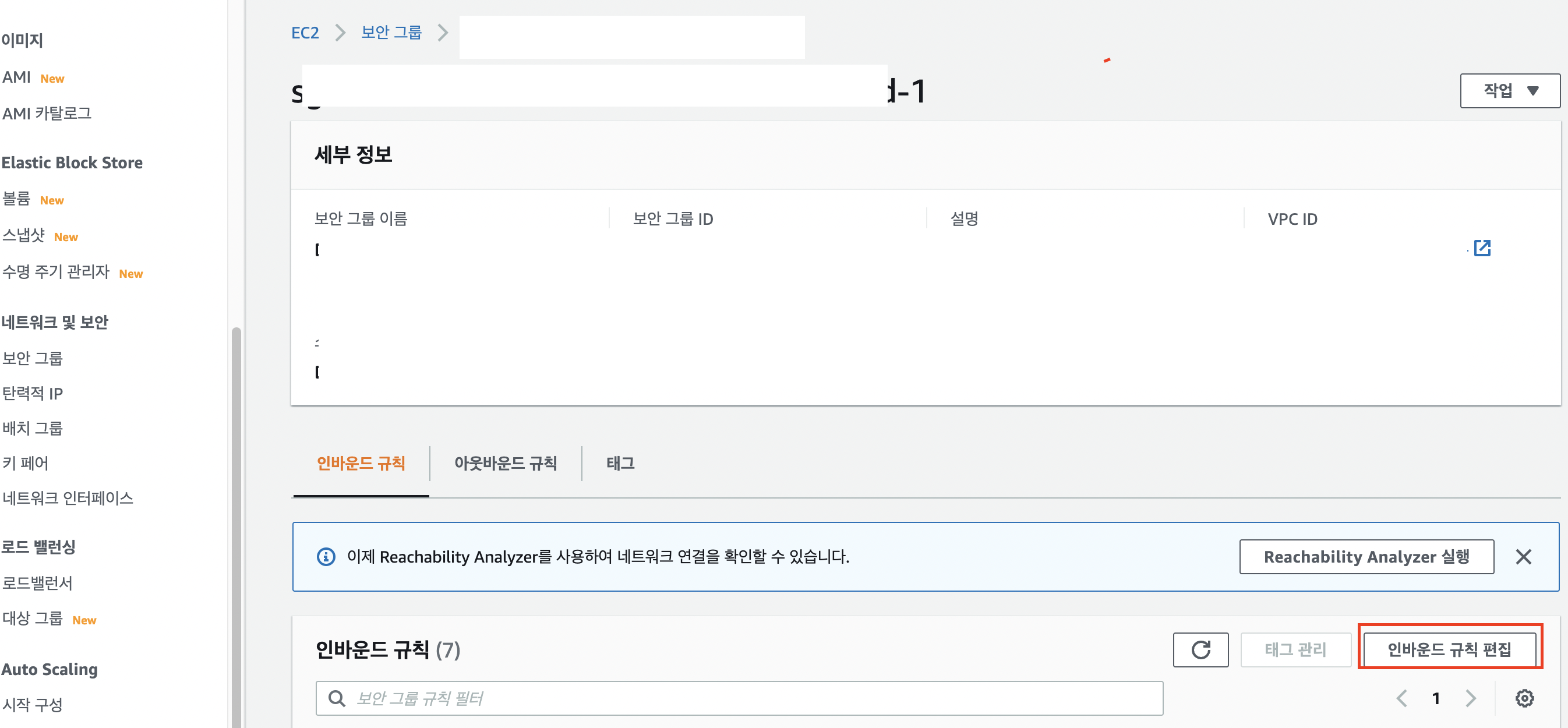 인스턴스의 보안 그룹 ID를 클릭한다. (보안 그룹 ID가 여러 개라 헷갈린다면, 사용 중인 인스턴스 요약으로 돌아가, '보안' 탭을 클릭하면 보안 그룹 정보를 얻을 수 있다.)