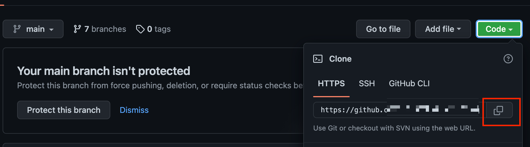 가져올 리파지토리에 들어가서 Code의 HTTPS 주소를 복사해온 후,