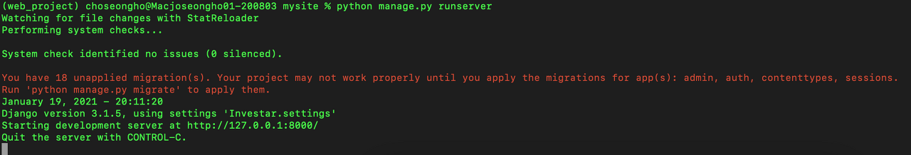 이때, migrate 명령어를 사용하라는 문구가 발생할텐데, migrate도 한 번 해주면 된다.