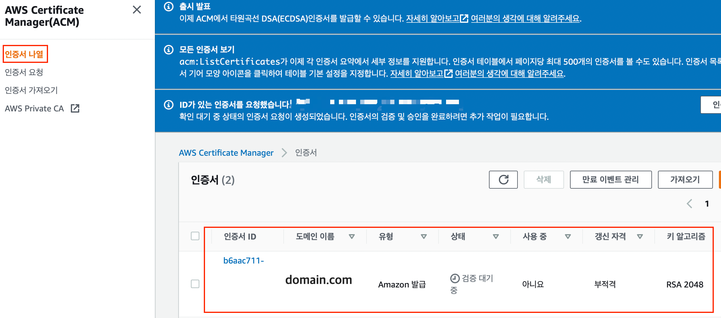 ACM(AWS Certification Manager)를 통해 SSL(TSL) 인증서를 발급받았습니다.